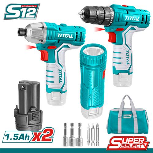 Bộ combo máy siết vít, máy khoan và đèn pin dùng pin hiệu Total TKLI1203