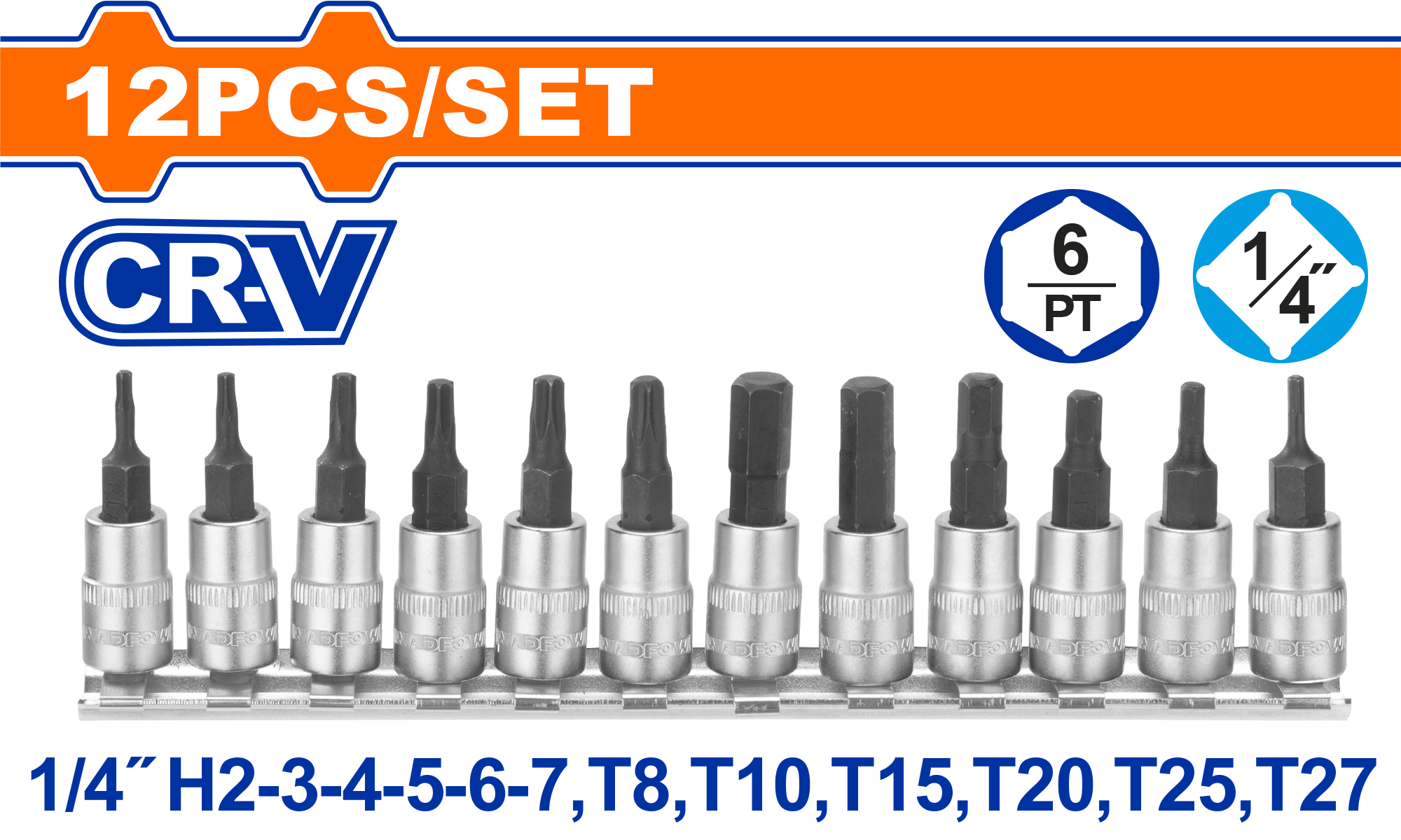 Bộ 12 đầu tuýp1/4″ ra đầu vít lụ giác, sao